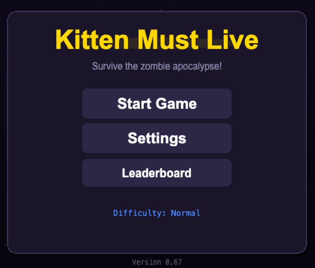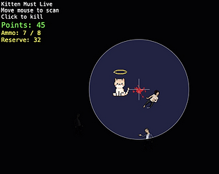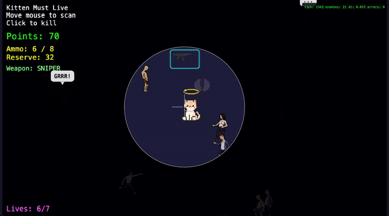 A top-down survival shooter where you defend an innocent kitten against endless waves of zombies. Fast mouse-aim shooting, limited ammo, and score-based survival.